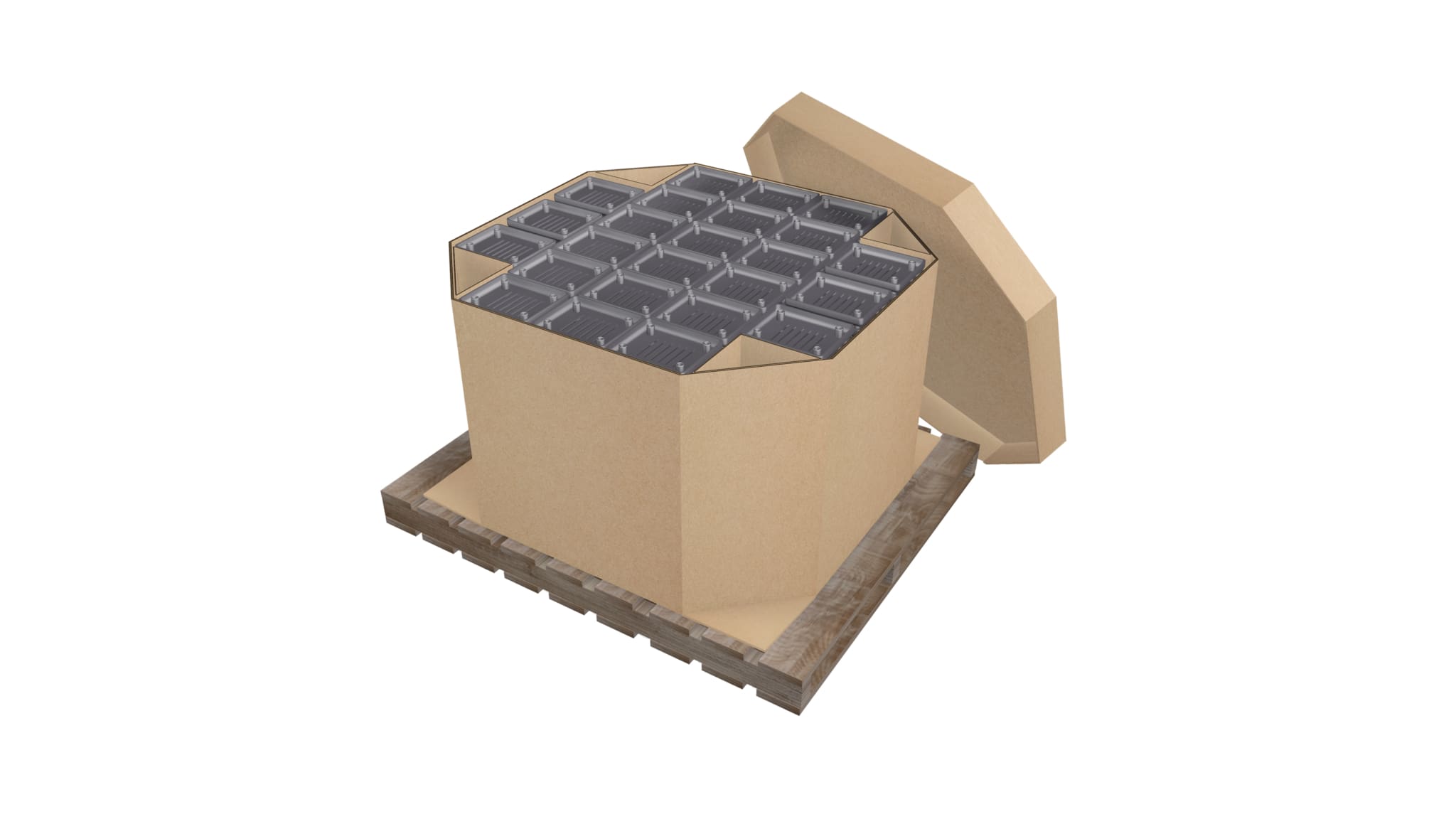 Octagonal bulk bin packaging for beef, poultry and pork. Can be belly-banded for additional support and bulge resistance.